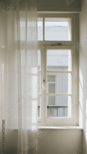 © Pham, Fototapeta premium Brightly lit window with sheer white curtains and a view of an adjacent building