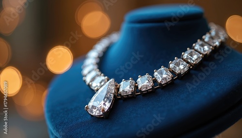 © Maryna, Fototapeta premium Brilliant diamond necklace with clear gems rests on dark blue velvet display stand. Expensive jewelry piece features large teardrop stone, many square cut diamonds. Shines with elegance, perfect