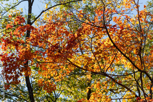 © Barbara, Fototapeta premium Brilliant Fall Colored Leaves In The Trees Along The Fox River Trail In Wisconsin