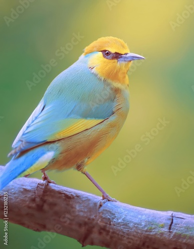 © Oleh Marchak, Fototapeta premium Brilliant firefly bird perched gracefully on a branch amidst lush greenery in the early morning light