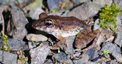 Naklejka premium Brilliant Forest Frog Lithobates warszewitschii resting on rocks in tropical...
