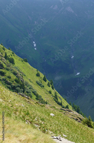 © etra_arte, Naklejka premium Brilliant green hillside with a dark mountain on the background