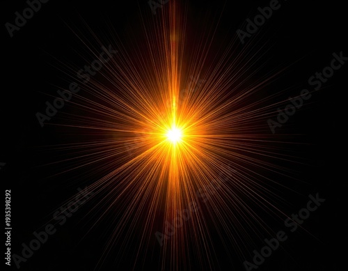 © Zubair, Fototapeta premium Brilliant orange lens flare radiates intensely against a stark black background.