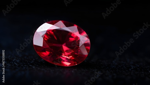 Naklejka premium Brilliant oval cut red gemstone on dark textured surface
