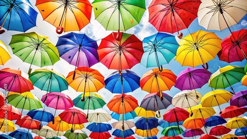 Naklejka premium Brilliantly hued umbrellas unfurl and float in mid-air, their vibrant colors...