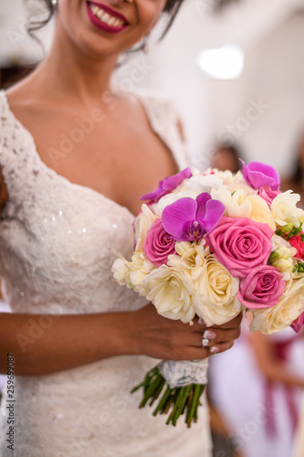 Naklejka premium Brinde in wedding dress posing with bouquet of flowers in hands