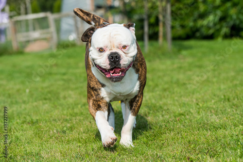 Fototapeta premium Brindle coat American Bulldog dog in move on grass