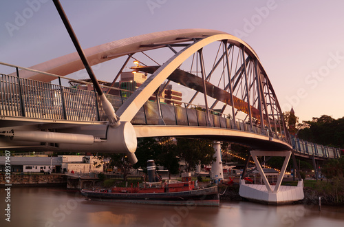 Naklejka premium Brisbane goodwill Bridge with tug boat forcefull underneath at sunset