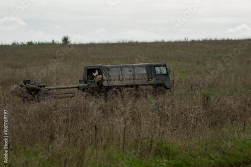 © Martin, Fototapeta premium British army bae systems, Puch, Daimler, Pinzgauer High-Mobility All-Terrain 6x6 vehicle towing a 105mm Light Artillery Gun on a military exercise