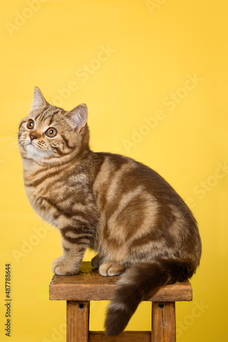 © Olga Romankova, Obraz premium British kitten of marble chocolate color on a yellow background.