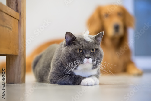 © chendongshan, Naklejka premium British shorthair cats and Golden Retriever