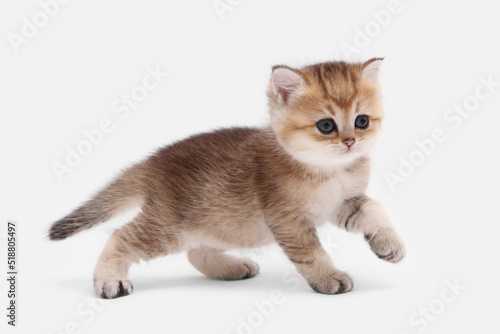 Obraz premium British shorthair kitten of golden color on white background and green...