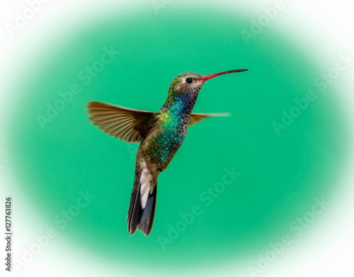 © Hummingbird Art, Fototapeta premium Broad Billed Hummingbird. Using different backgrounds the bird becomes more interesting and blends with the colors. These birds are native to Mexico and brighten up most gardens where flowers bloom.