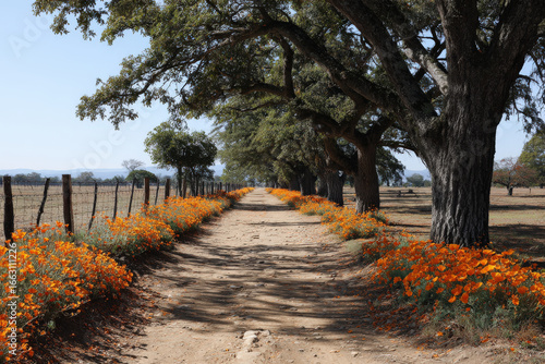 Naklejka premium broad dirt road leads into distance surrounded by colorful wildflowers on either side
