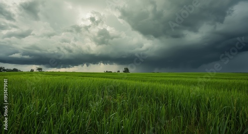 Fototapeta premium Broad meadow of lush grass covered by heavy rain clouds signaling storm