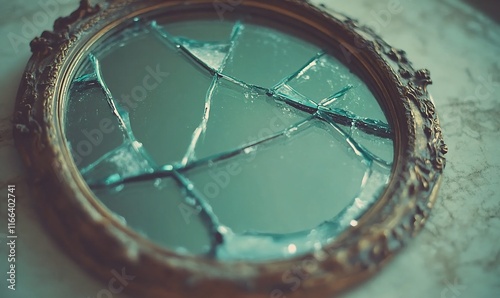 Obraz premium Broken antique mirror on marble surface, reflecting distorted view
