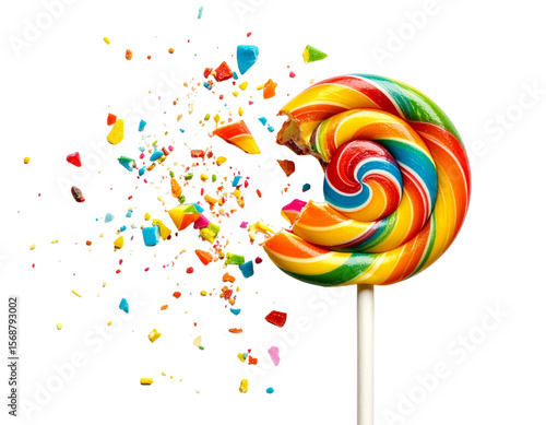 © Mostafijur, Fototapeta premium Broken Colorful Lollipop with Candy Shards Scattered White Background PNG