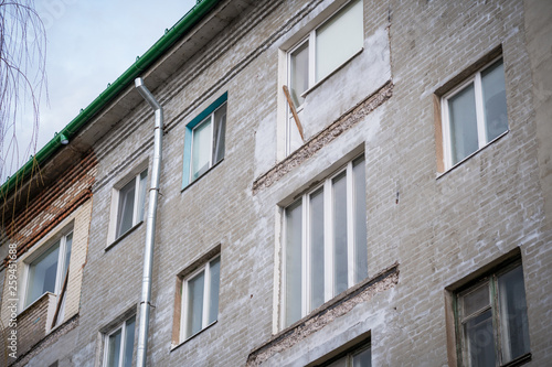 © игорь соколов, Fototapeta premium Broken concrete balcony on the facade of the building. Restoration of an old residential gray plastered house. White plastic windows and an exit with a door.