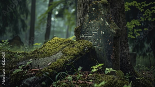Obraz premium Broken, mossy gravestone resting against a tree in a forgotten corner of a mist-covered forest cemetery