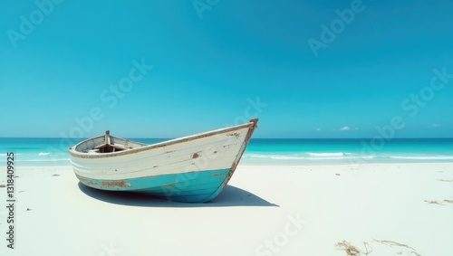 Naklejka premium Broken piece of a boat located on a white sand beach