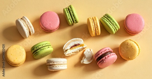 © TamasSzora, Obraz premium broken round macarons with crumbs on a yellow background, delicious dessert, top view
