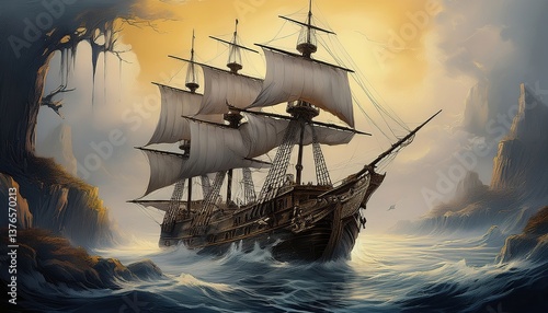 © Oleh, Obraz premium Broken Sails Catch Ghostly Winds of Night