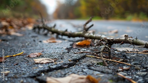 © han, Fototapeta premium Broken tree branch on cracked pavement surrounded by scattered leaves and debris, depicting aftermath of strong winds and stormy weather, environmental damage concept.