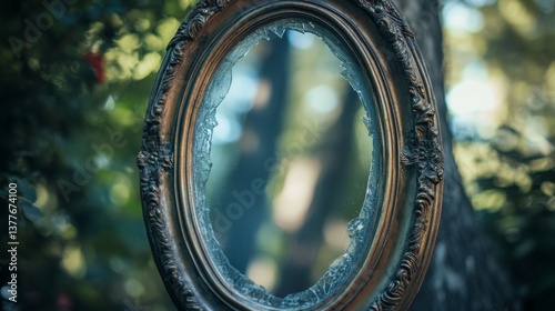 © Atmospheric stock, Obraz premium Broken vintage mirror with ornate frame in forest setting