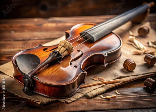 © chokdeelaw, Fototapeta premium Broken violin strings exposed on a wooden scroll in a close-up studio shot