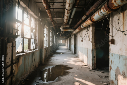 © Oktavianus, Fototapeta premium Broken Windows and Puddles in Industrial Corridor