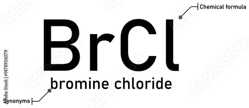 Obraz premium Bromine chloride chemical formula and synonyms with callout titles
