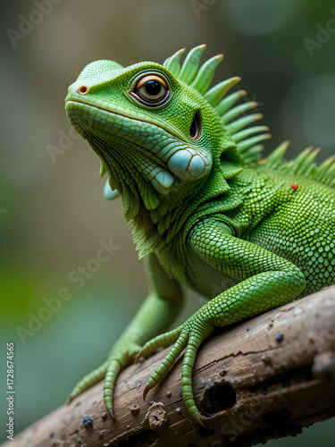Fototapeta premium Bronchocela jubata, the green crested lizard, rests on a branch, exhibiting vivid green scales, keeled skin texture, and adaptive camouflage suited for tropical foliage.