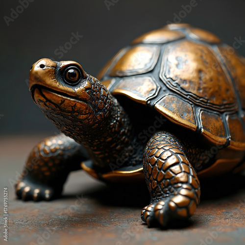 Obraz premium Bronze turtle sculpture with detailed shell and head. Artwork portrays animal figurine standing still. Handcrafted statue features realistic texture. Perfect for decor or art collection.