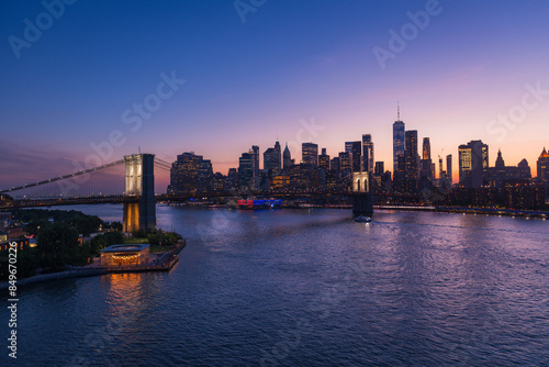 © Andrés García, Fototapeta premium Brooklyn Bridge and New York skyline across the East River under an intense sunset.
