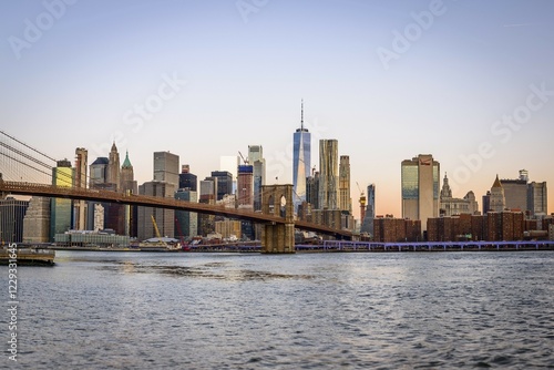 © Valentin Wolf/imageBROKER, Naklejka premium Brooklyn Bridge at sunrise, view from Main Street Park over the East River to the skyline of Manhattan with Freedom Tower or One World Trade Center, Dumbo, Downtown Brooklyn, Brooklyn, New York