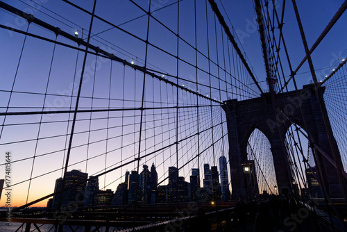 Obraz premium Brooklyn Bridge at Sunset with Blue Tones and Cable Web Pattern, New York City, USA