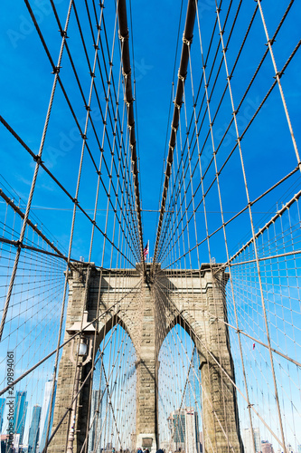 Fototapeta premium Brooklyn bridge over water, blue sky with sunshine