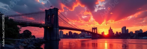 Naklejka premium Brooklyn Bridge silhouette against fiery sunset sky, manhattan, golden hour