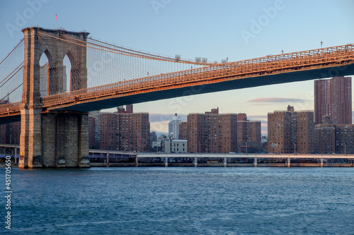 Fototapeta premium Brooklyn Bridge spanning the East River from Brooklyn into New York City at...