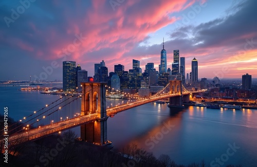 © Vadym, Fototapeta premium Brooklyn Bridge spans river at twilight with New York City skyline. Colorful clouds paint sky above illuminated skyscrapers and towers. Water reflects city lights.