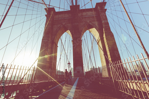 © Curioso.Photography, Obraz premium Brooklyn Bridge w Nowym Jorku. Sławny punkt zwrotny w usa przy ranku światłem.
