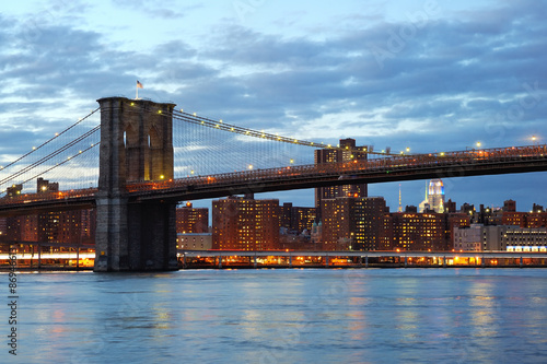 © Maria Sbytova, Obraz premium Brooklyn Bridge with downtown skyline at dusk