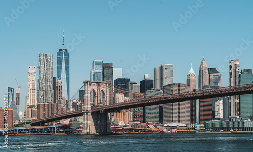 Naklejka premium Brooklyn Bridge with Manhattan skyscrapers in daylight, realistic photo...