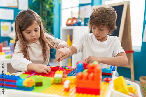 © Krakenimages.com, Fototapeta premium Brother and sister playing with construction blocks sitting on table at kindergarten
