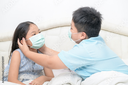 © kwanchaichaiudom, Obraz premium Brother helping his sister wearing surgical mask on bed,