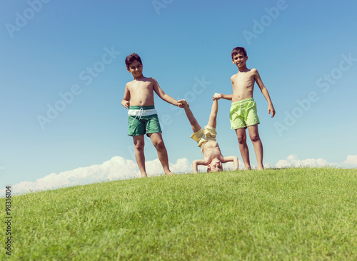 © Jasmin Merdan, Obraz premium Brothers playing upside down on green meadow