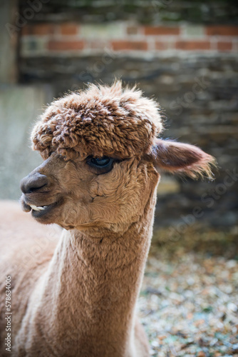 © James Bailey, Obraz premium Brown alpaca standing in a farm barn