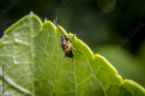 © Aldemar, Fototapeta premium Brown and black bug with long antennas on leaf