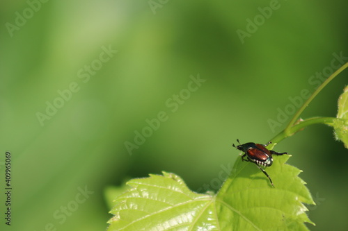 © Kayla, Fototapeta premium brown and blue bug on green leaf