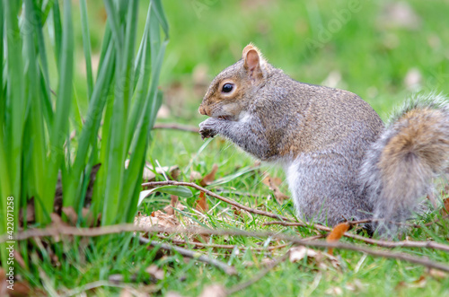 Obraz premium Brown and grey squirrel eating by a daffodil bunch of leaves